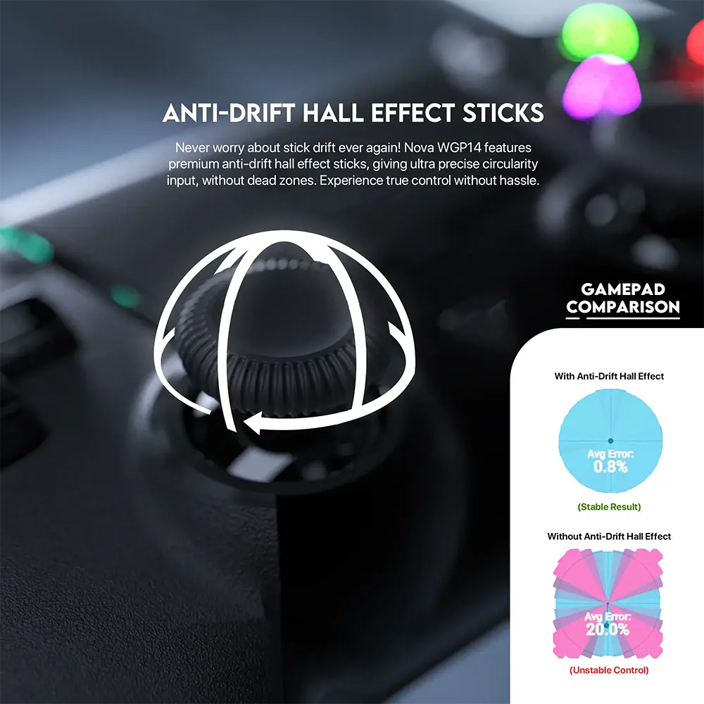 Never worry about stick drift ever again! Nova WGP14 features premium anti-drift hall effect sticks, giving ultra precise circularity input, without dead zones. Experience true control without hassle. Best of all, it uses authentic K-Silver JH16 hall-effect sticks which provide better centering and deadzone performance than other hall-effect controllers.